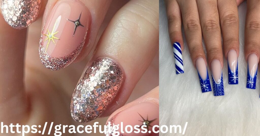 Designs like glitter accents, metallic finishes, starry patterns, and French tips pair beautifully with dark blue nails.