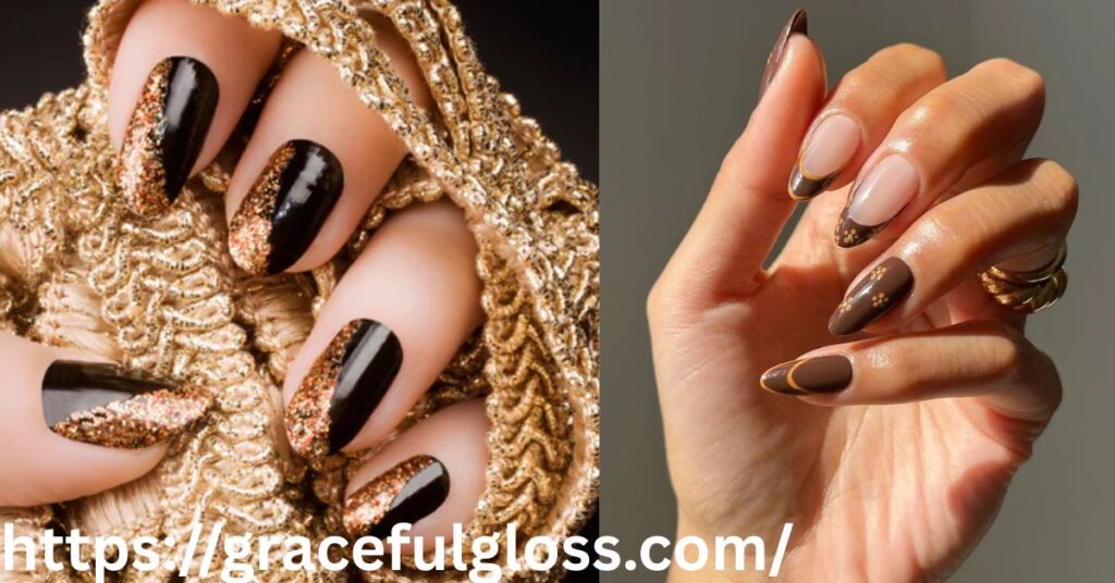 For those who love a touch of sparkle, glittery brown nails add glamour and festivity to any manicure. Fine gold or bronze glitter enhances the richness of brown tones, creating a dazzling effect. Whether you opt for a fully glittered nail or just an accent, this look is perfect for special occasions. A glossy finish maximizes the shimmer, while a matte base adds contrast for a unique touch. Glittery brown nails combine elegance with a bold statement, making them ideal for holiday-ready fall styles.